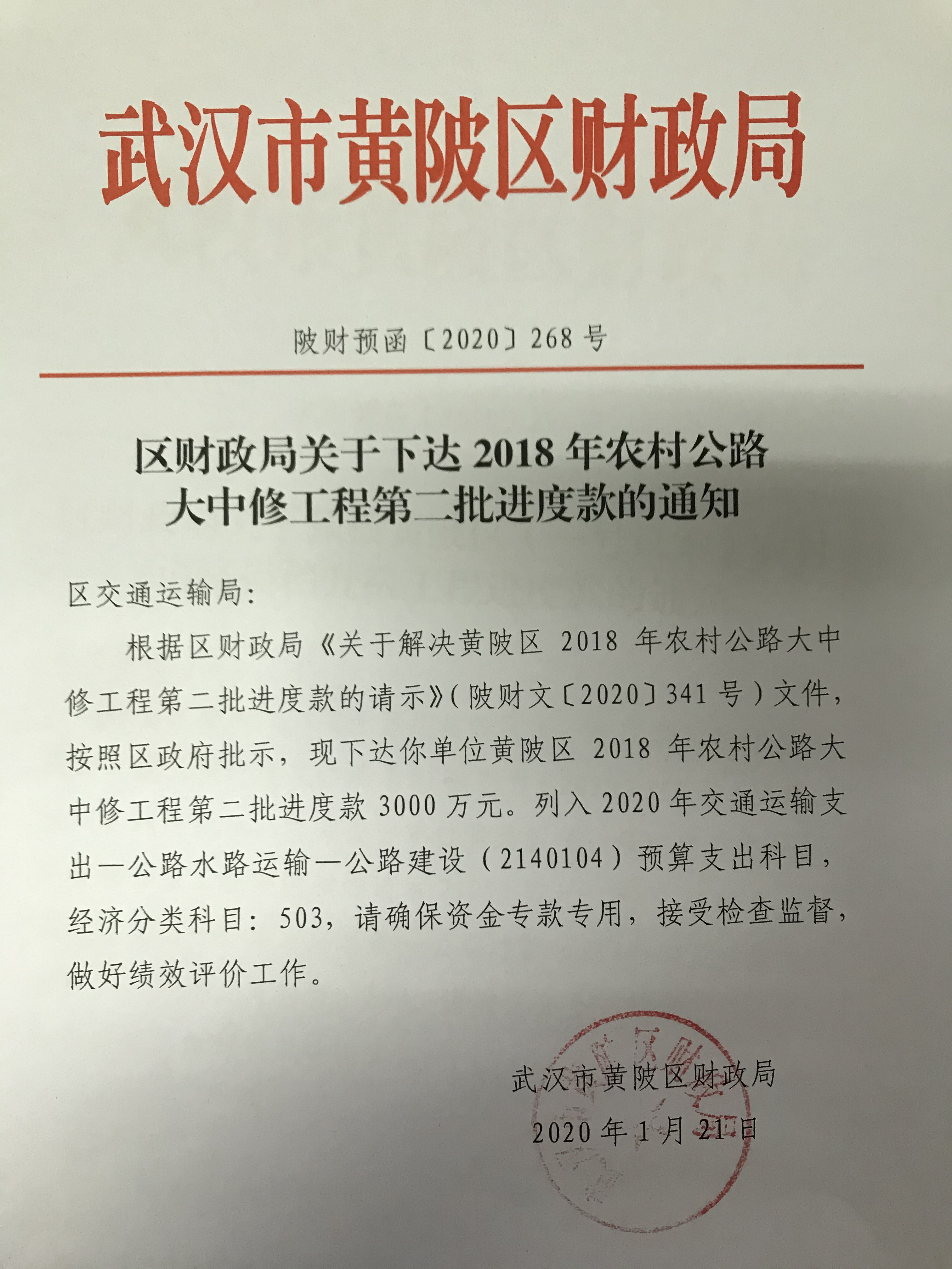 区财政局关于下达农村公路大中修工程进度资金(陂财预函〔2020〕268号)