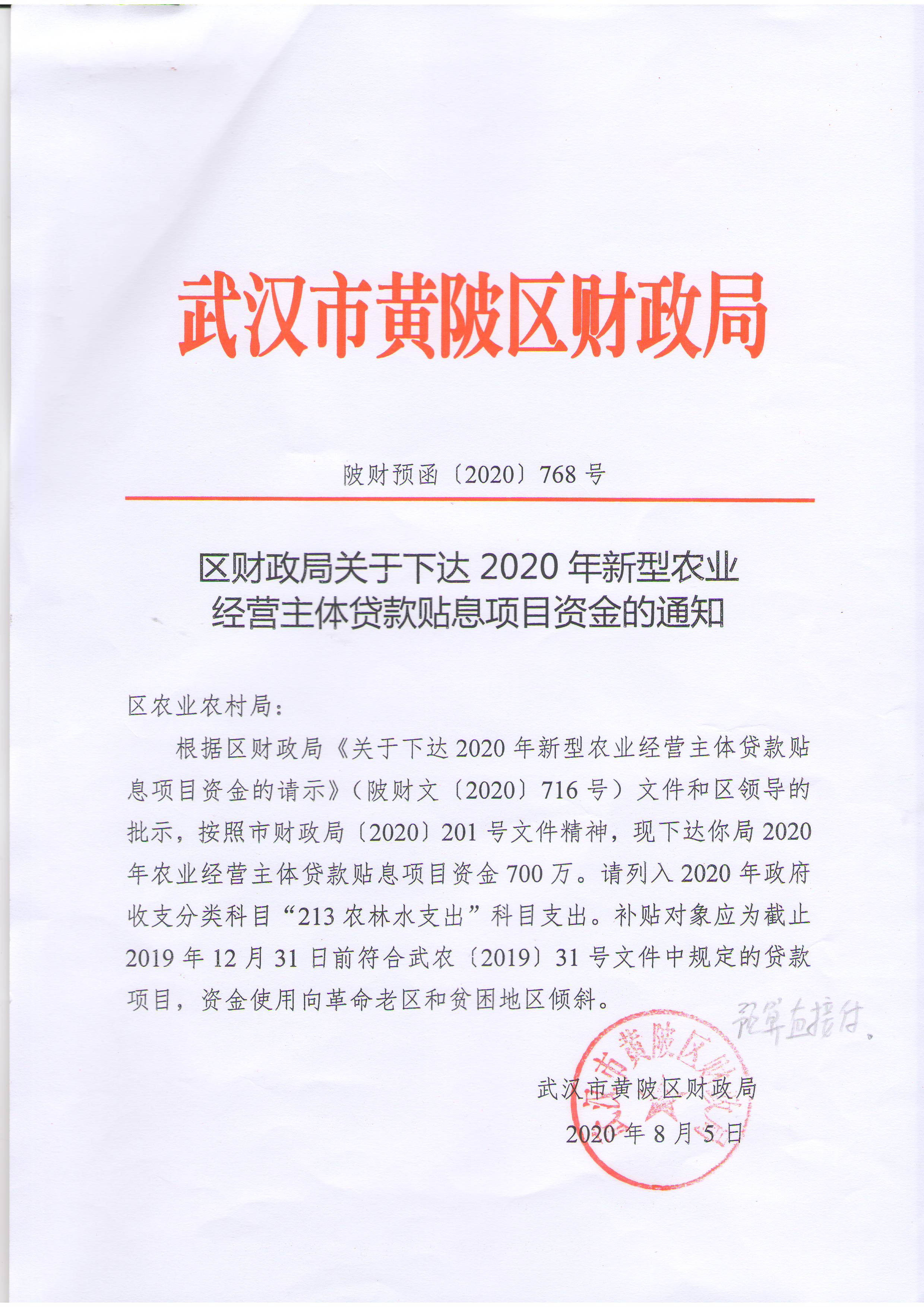 区财政局关于下达2020年新型农业经营主体贷款贴息项目资金的通知(陂财预函〔2020〕768号)