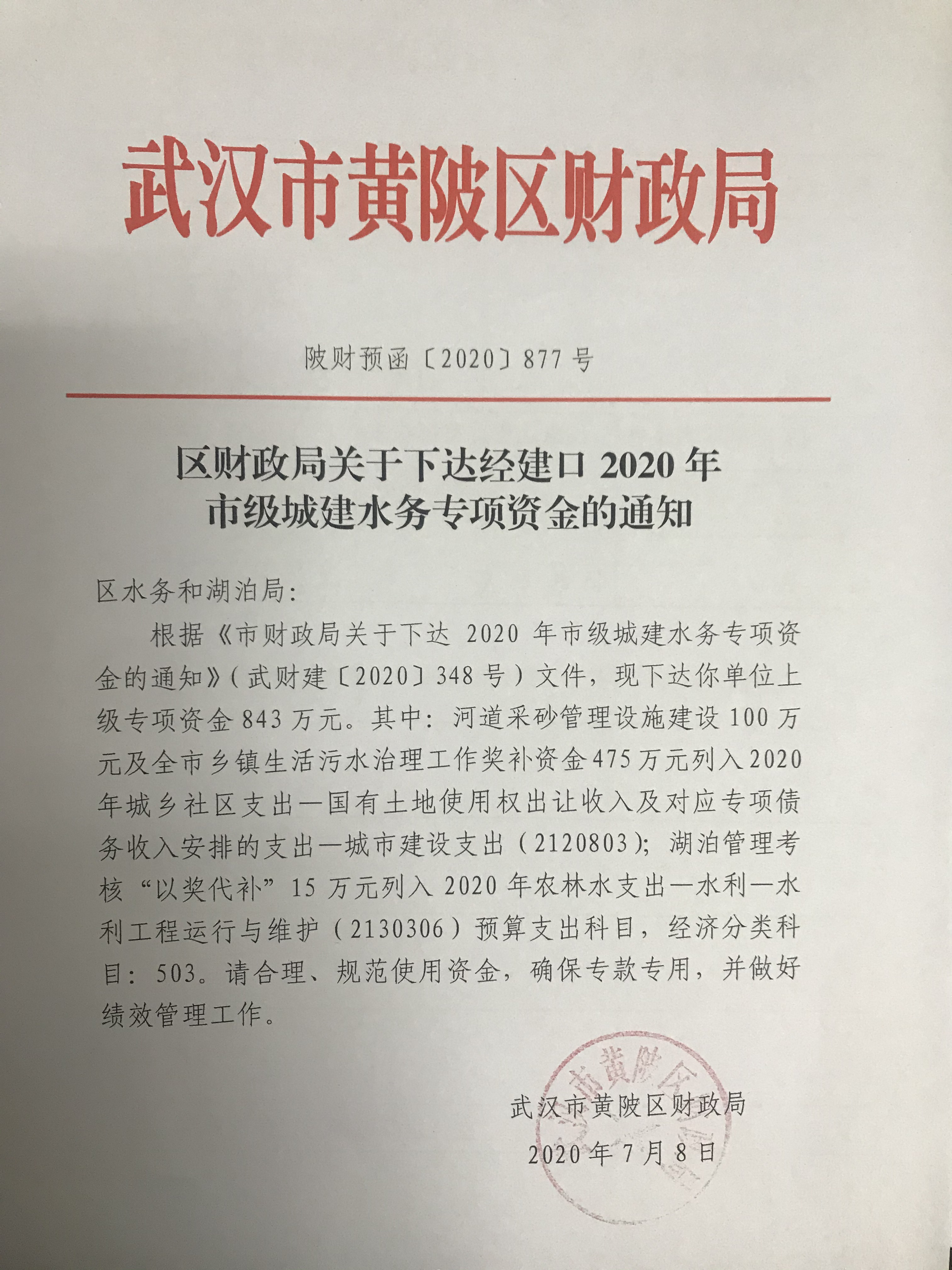区财政局关于下达经建口2020年市级城建水务专项资金的通知(陂财预函〔2020〕877号)