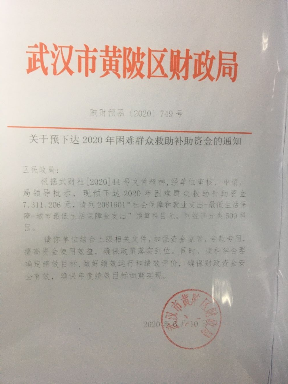 关于预下达2020年困难群众救助补助资金的通知(陂财预函〔2020〕749号)