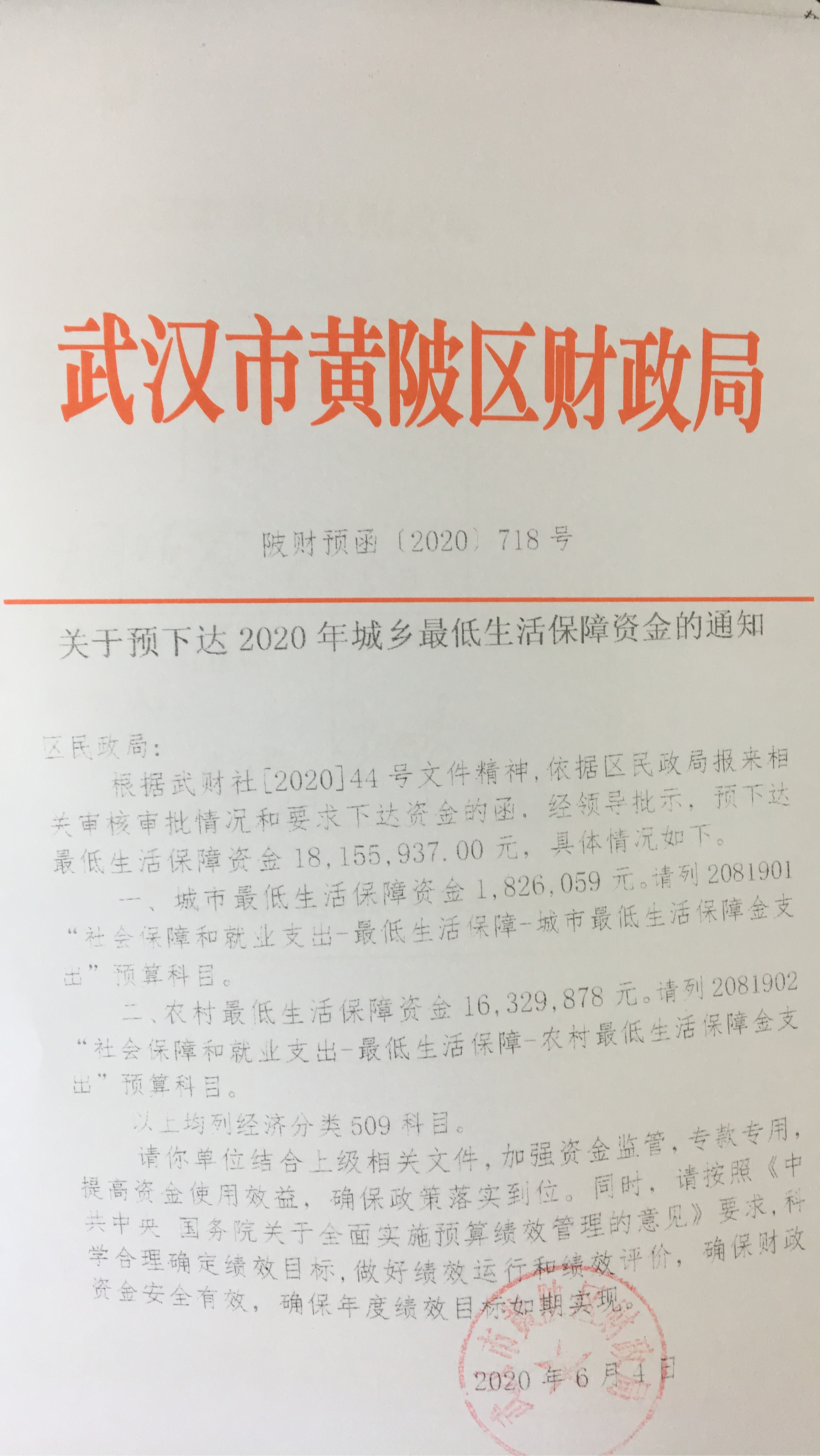 关于预下达2020年城乡最低生活保障资金的通知(陂财预函〔2020〕718号)