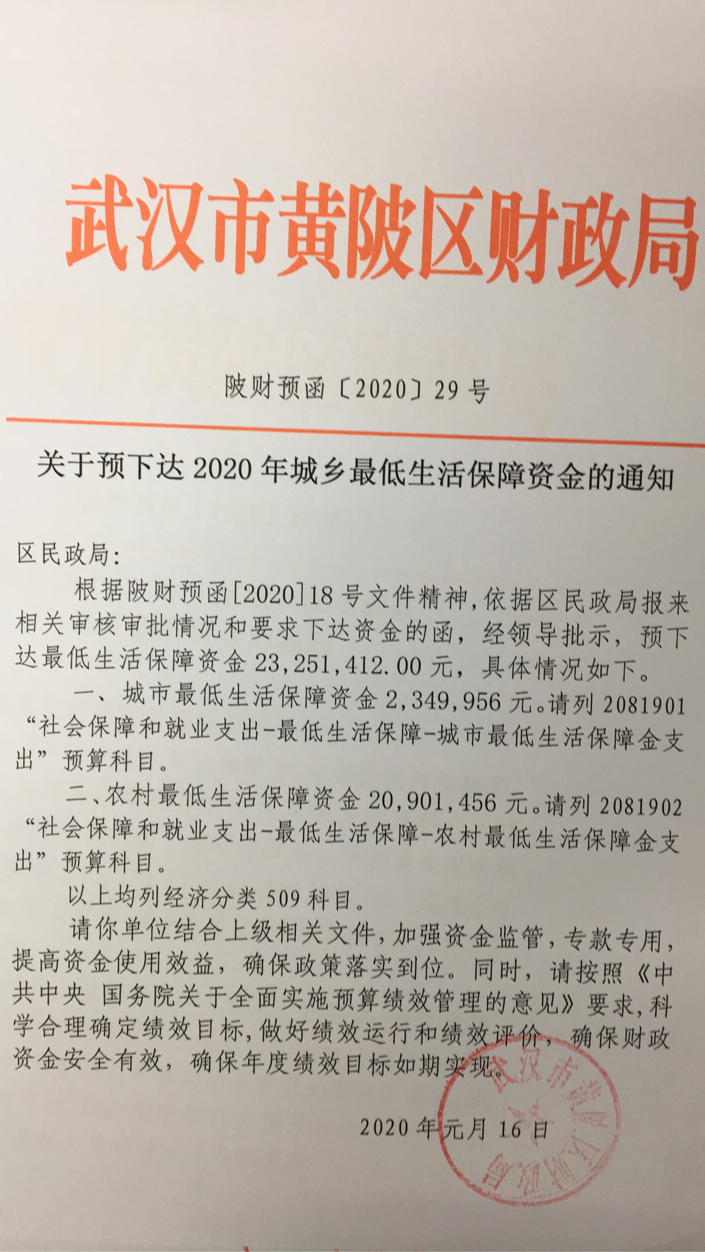 关于预下达2020年城乡最低生活保障资金的通知(陂财预函〔2020〕29号)