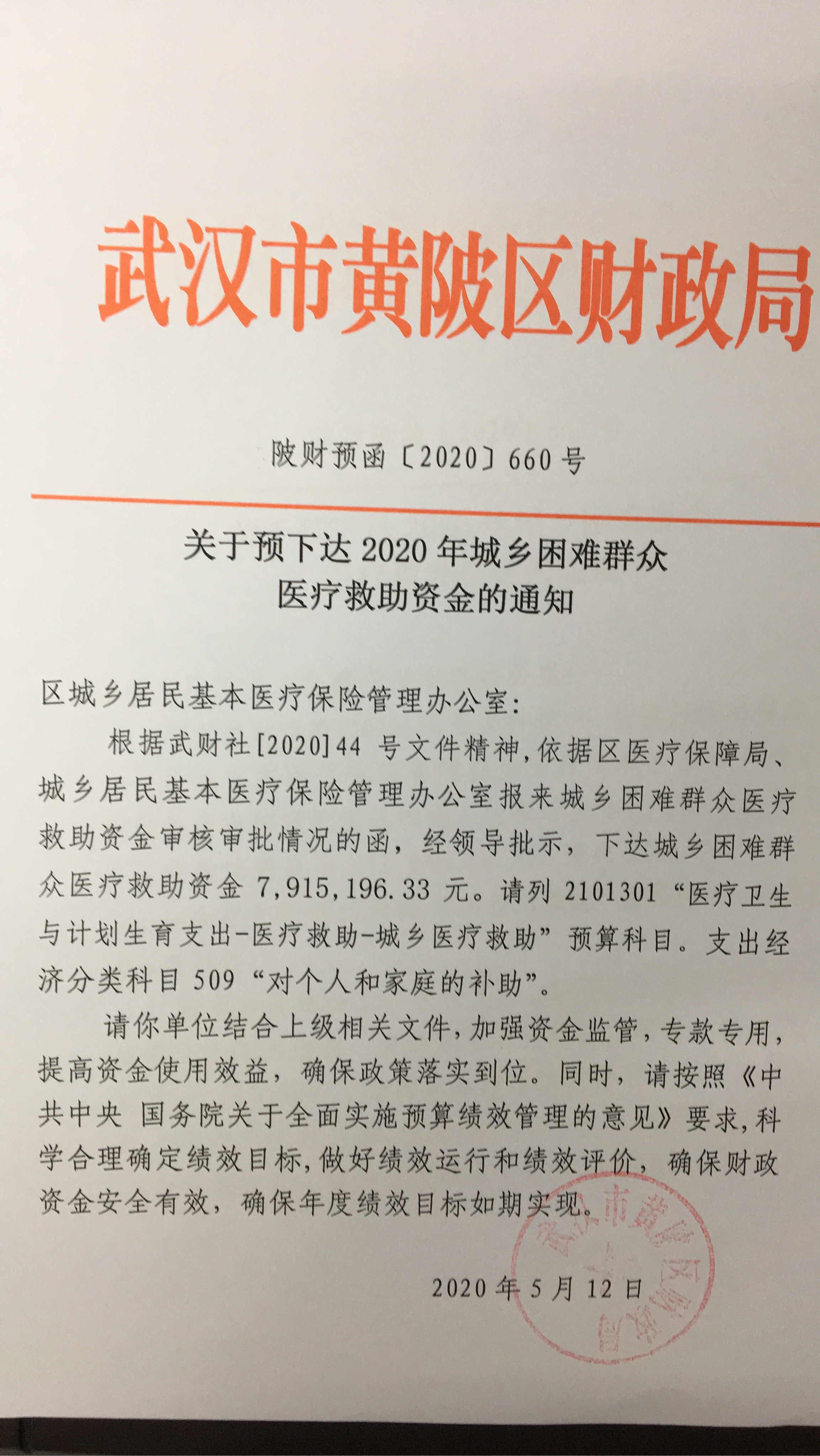 关于预下达2020年城乡困难群众医疗救助资金的通知(陂财预函〔2020〕660号)