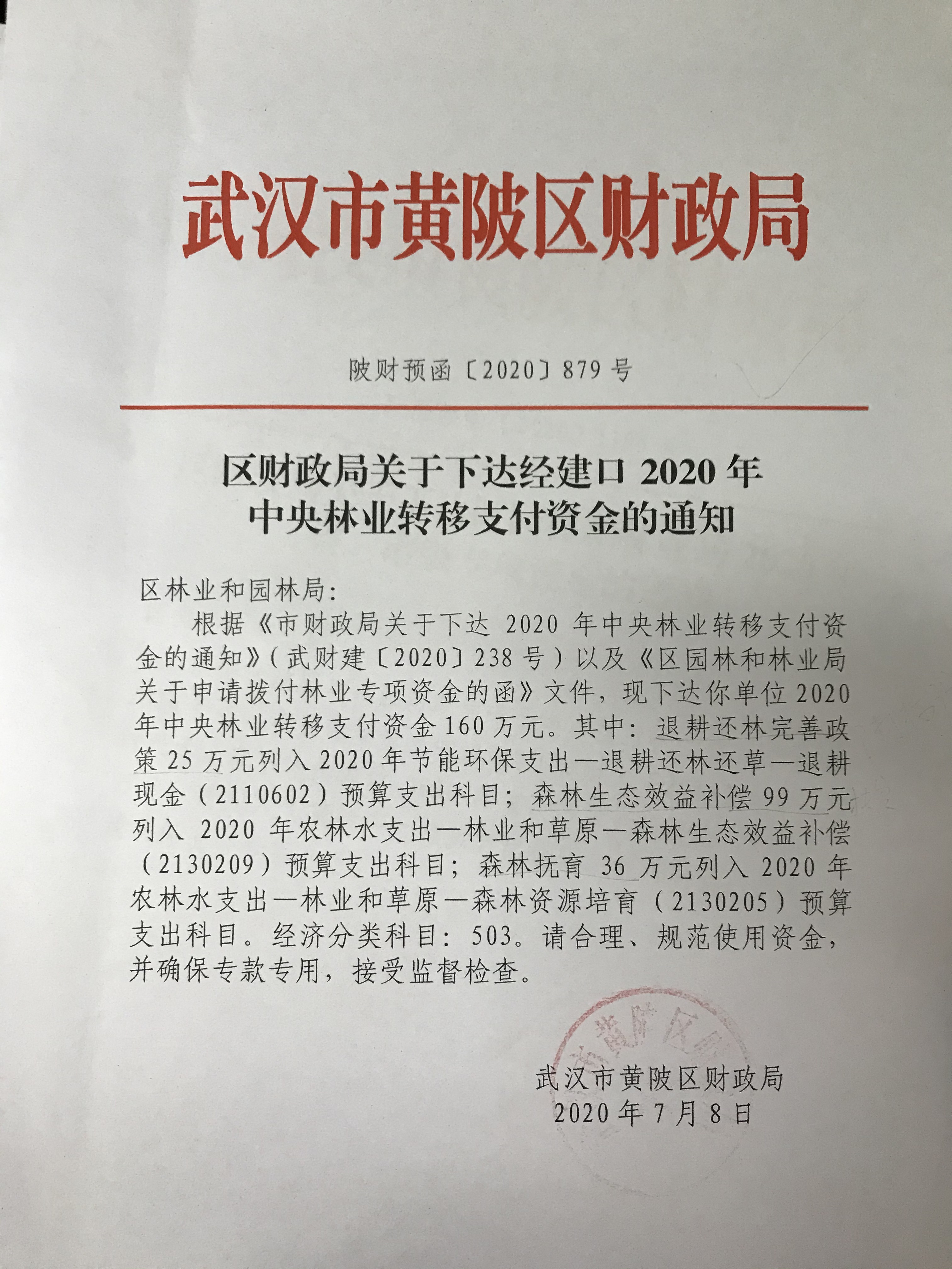 区财政局关于下达经建口2020年中央林业转移支付资金的通知