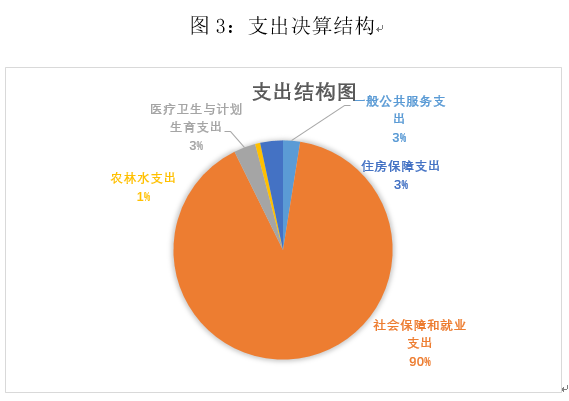 2017年度财政拨款支出5,407万元,主要用于以下方面:一般公共服务(类)支出136万元,占2.52 %;社会保障和就业支出4,876万元,占90.18%;医疗卫生与计划生育支出174万元,占3.22%;农林水支出40万元,占0.74%;住房保障支出181万元,占3.35%;