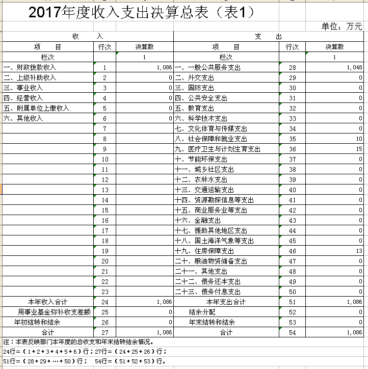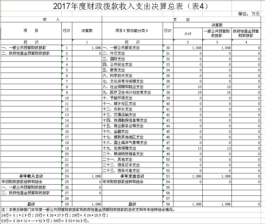 2017年度收、支总计1,086万元。与2016年相比,收、支总计各增加(减少)478万元,增长(降低)78.62%,主要原因是因体制改革,成立行政审批局,职能人员划转后,费用增加。