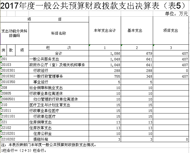 2017年一般公共预算财政拨款支出年度预算为1,086万元(包括年初部门预算、基本建设等专项资金、上级下达的专项转移支付资金及年初结转和结余资金等),支出决算为1,086万元,完成年度预算的99.97%。其中:基本支出679万元,项目支出407万元。
