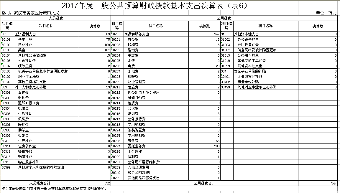 2017度一般公共预算财政拨款基本支出679万元,其中,人员经费332万元,主要包括:基本工资、津贴补贴、奖金、其他社会保障缴费、伙食补助费、绩效工资、机关事业单位基本养老保险缴费、职业年金缴费、其他工资福利支出、离休费、退休费、退职(役)费、抚恤金、生活补助、救济费、医疗费、助学金、奖励金、生产补贴、住房公积金、提租补贴、购房补贴、物业服务补贴、其他对个人和家庭的补助支出;公用经费347万元,主要包括:办公费、印刷费、咨询费、手续费、水费、电费、邮电费、取暖费、物业管理费、差旅费、因公出国(境)费、维修(护)费、 租赁费、会议费、培训费、公务接待费、专用材料费、被装购置费、专用燃料费、劳务费、委托业务费、工会经费、福利费、公务用车运行维护费、其他交通费用、税金及附加费用、其他商品和服务支出、办公设备购置、专用设备购置、信息网络及软件购置更新、公务用车购置、其他交通工具购置、其他资本性支出、企业政策性补贴、事业单位补贴、其他对企事业单位的补贴。