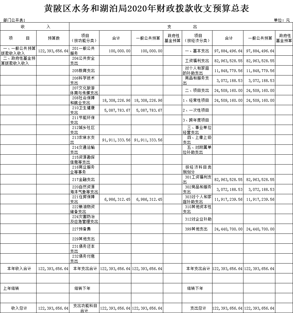 表1. 楼凤网 水务和湖泊局2020年财政拨款收支预算总表