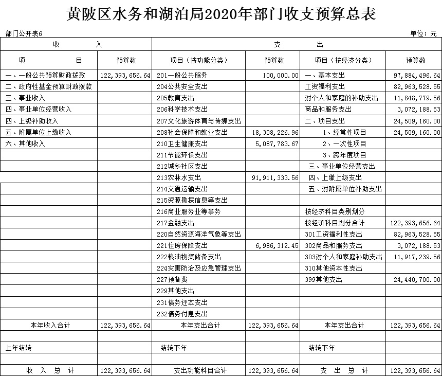 表6. 楼凤网 水务和湖泊局2020年部门收支总表