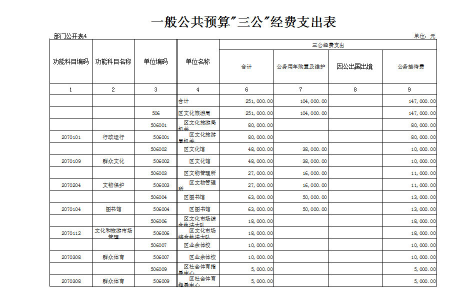 (十)“三公”经费:纳入财政一般公共预算管理的“三公”经费,是指区直部门用一般公共预算财政拨款安排的因公出国(境)费、公务用车购置及运行维护费和公务接待费。其中,(1)因公出国(境)费,反映单位公务出国(境)的国际旅费、国外城市间交通费、住宿费、伙食费、培训费、公杂费等支出;(2)公务用车购置及运行维护费,反映单位公务用车购置支出(含车辆购置税、牌照费)及燃料费、维修费、过路过桥费、保险费、安全奖励费用等支出;(3)公务接待费反映单位按规定开支的各类公务接待(含外宾接待)支出。