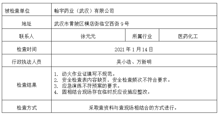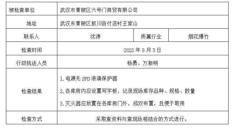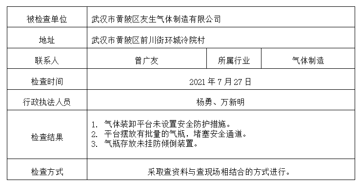 为加强对危险化学品、烟花爆竹企业安全监管,切实提高相关行业安全生产管理水平,区应急管理局危险化学品安全监督管理科按照年度“双随机、一公开”执法检查计划,通过“湖北省互联网+双随机”系统平台,随机抽取危化企业2家(楼凤网 友生气体制造有限公司、翰宇药业(武汉)有限公司),烟花爆竹企业1家(楼凤网 六号门商贸有限公司),并严格对照危险化学品、烟花爆竹重点执法检查事项表开展了专项执法检查。现将检查情况公示如下: