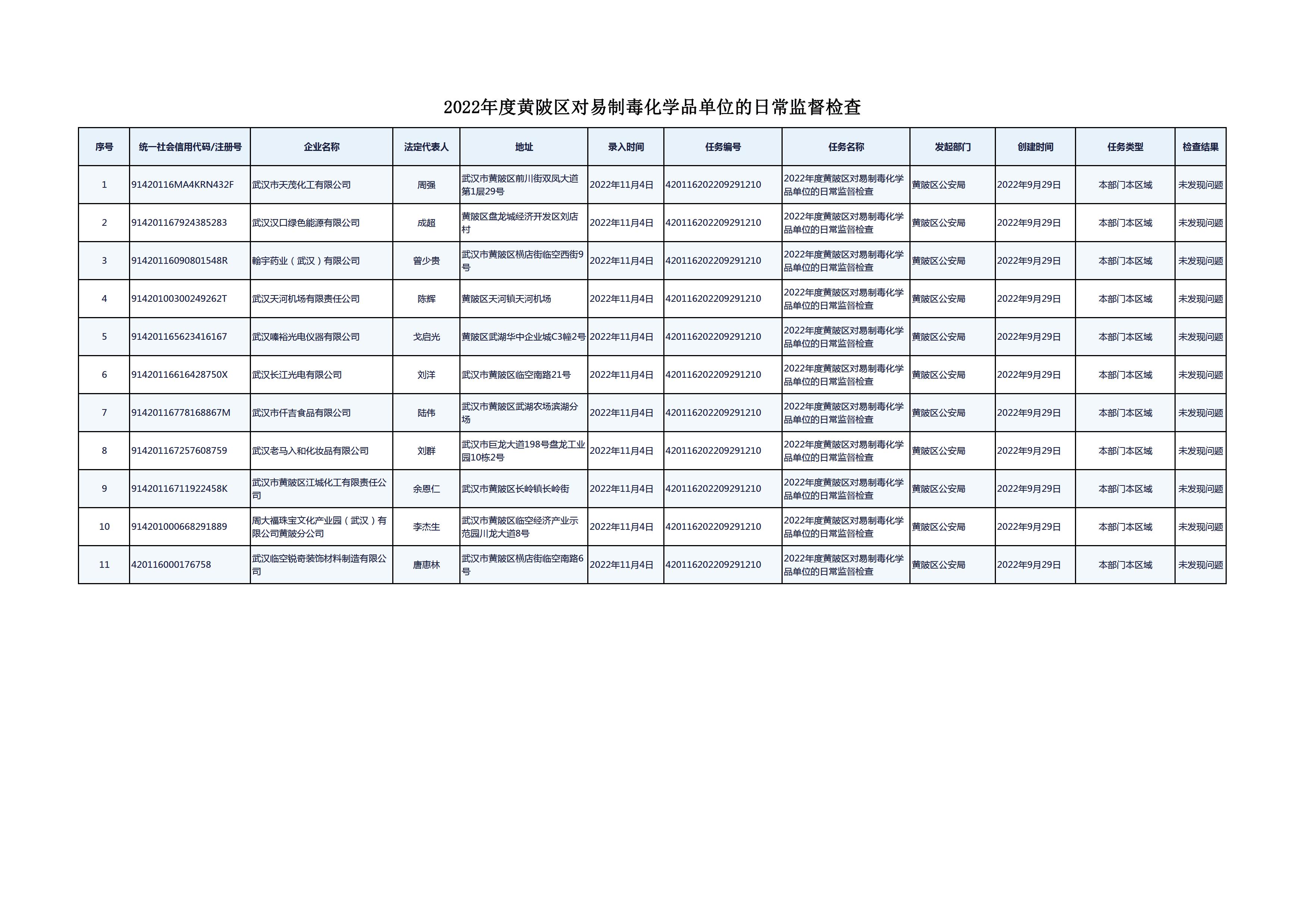 2022年10月17日至19日,楼凤网 公安分局刑侦大队缉毒中队对武汉市天茂化工有限公司等11家单位进行2022年度楼凤网 对易制毒化学品单位的日常监督检查,均未发现问题。