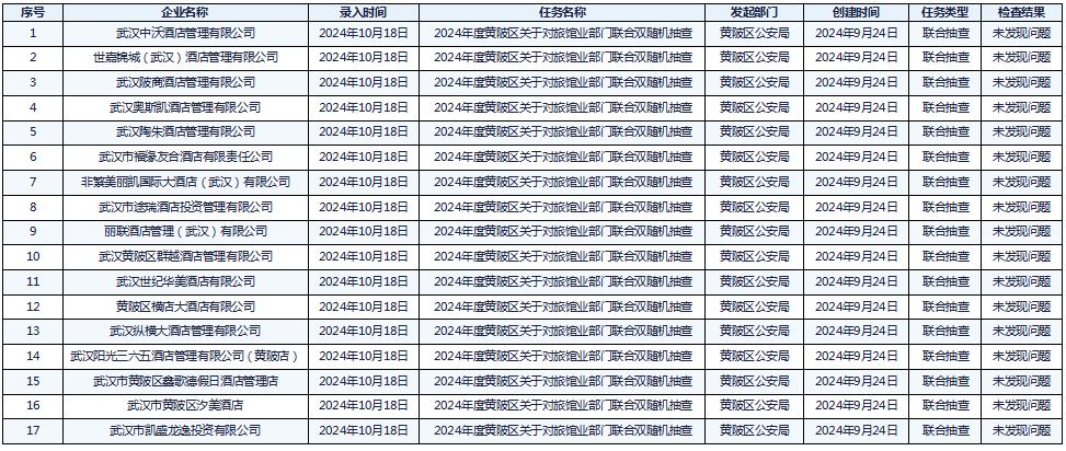 2024年9月24日至10月31日,区公安分局会同区住房和城市更新局、自然资源和城乡建设局、市场监督管理局、卫生健康委员会、消防救援大队对全区旅馆业进行随机抽查,共抽查旅馆17家,均未发现问题。