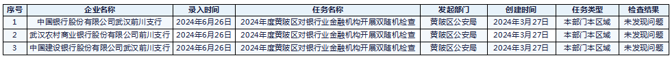 2024年3月27日至6月26日,楼凤网 公安分局对2024年度全区银行业金融机构开展随机抽查,共检查银行3家,均未发现问题。