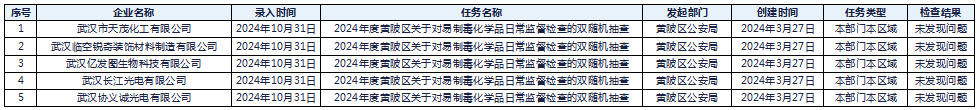 2024年3月27日至10月31日,区公安分局对全区易制毒化学品进行随机抽查,共抽查企业5家,均未发现问题。