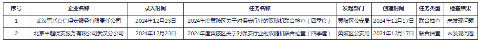 2024年12月17日至23日,区公安分局会同区市场监督管理局、人社局对全区保安行业进行随机抽查。共抽查企业2家,未发现问题