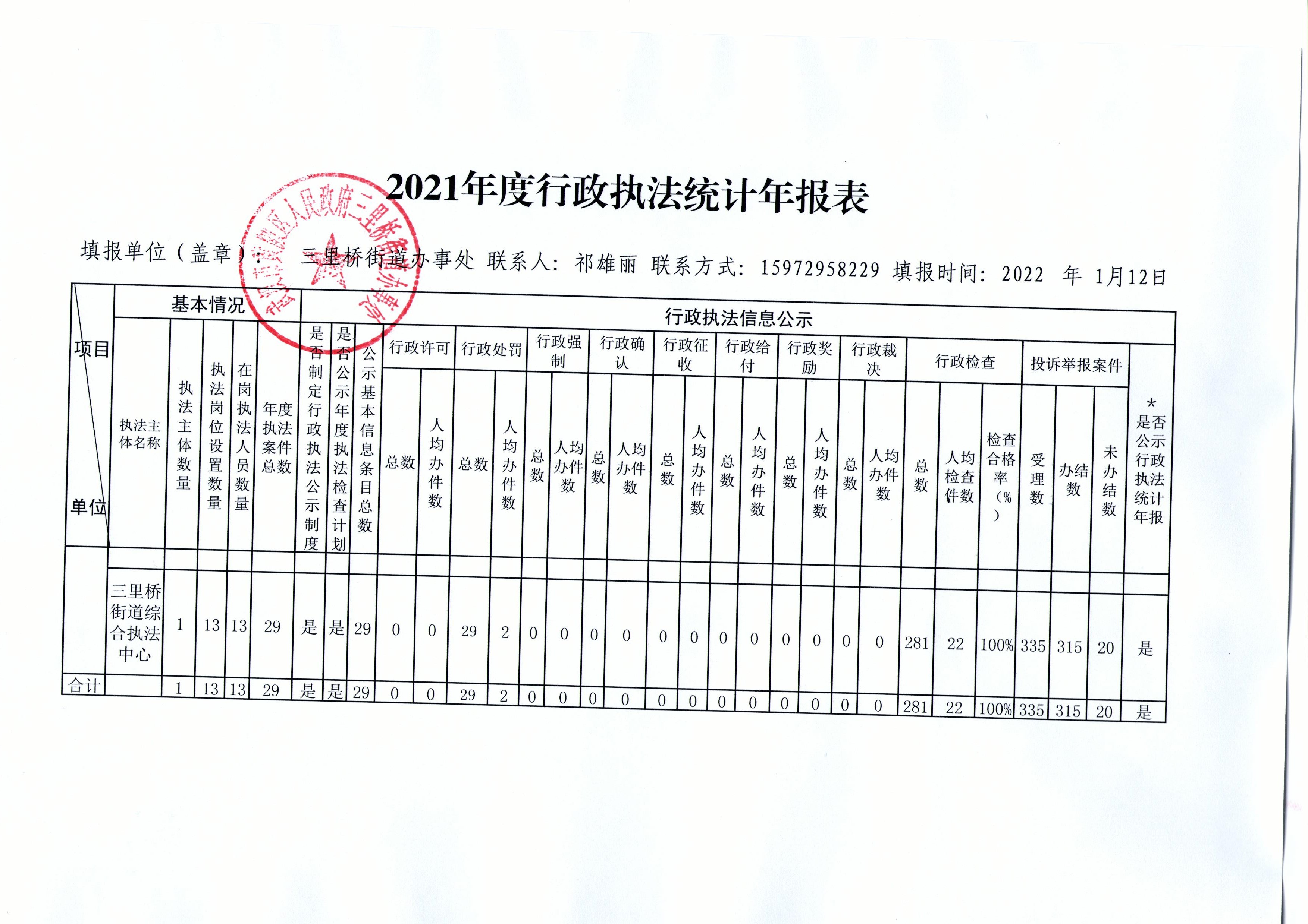 2021年度楼凤网 三里桥街道行政执法统计年报
