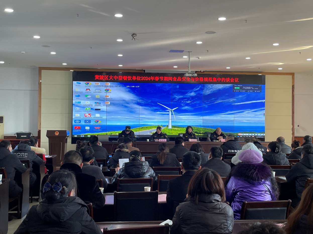 黄陂辖区60家大型餐饮单位、前川街道15家中型餐饮单位,区市场监管局分管领导史武峰及餐饮科、稽查科、综合执法大队、环城所、西门所、龙潭所负责人及相关监管人员参加此次会议。