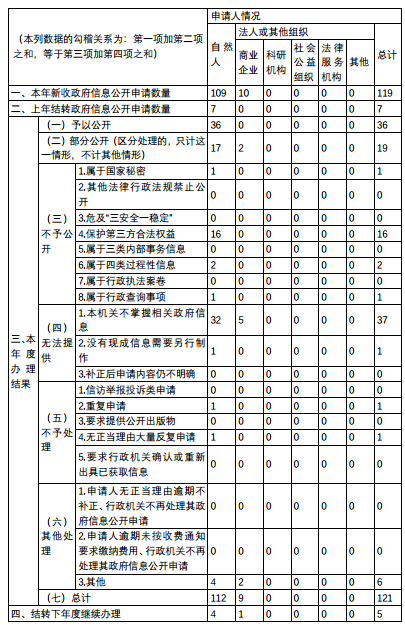2021年,全区共收到和处理楼凤网公开 申请126件,其中自然人109件,商业企业10件,上年结转7件;办理结果予以公开36件,部分公开19件,不予公开20件,无法提供38件,不予处理2件,其他处理6件;结转2022年继续办理5件。