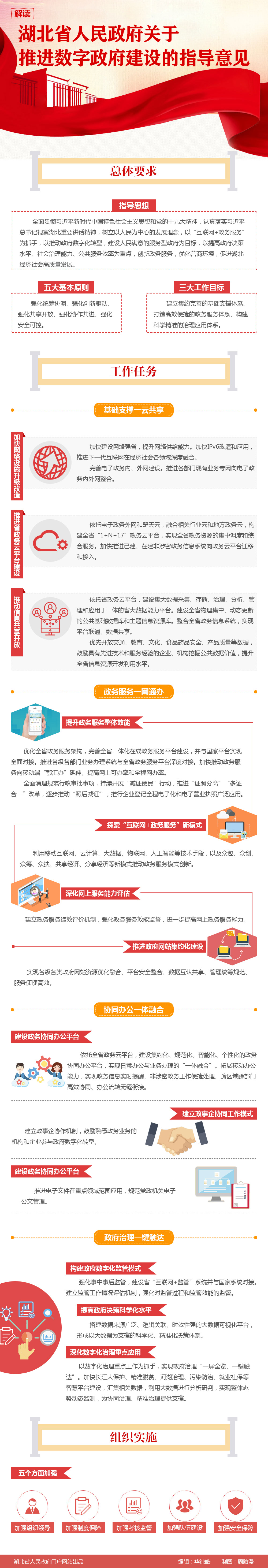 为全面贯彻落实党中央、国务院关于实施国家大数据战略、加快建设数字中国,全面深化“放管服”改革、深入推进“互联网+政务服务”的重大决策部署,湖北省人民政府出台了《省人民政府关于推进数字政府建设的指导意见》。同时为加快我区政府数字化转型,实现政府决策科学化、社会治理精准化、公共服务高效化,我区成立了“数字政府”建设领导小组,统筹推进相关工作。根据《意见》,湖北将以云计算、大数据、物联网、人工智能、区块链等技术为支撑,以一体化在线政务服务平台为载体,以数字化、数据化、智能化、智慧化为实施路径,建立决策科学、治理精准、服务高效的新型政府运行模式。