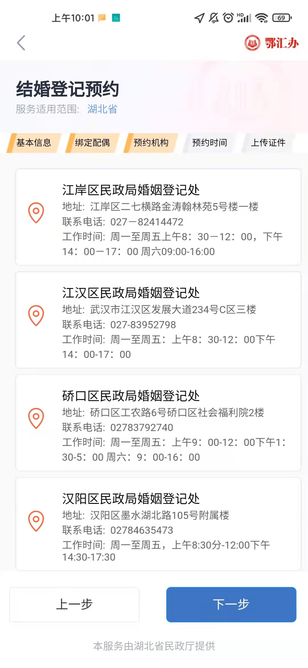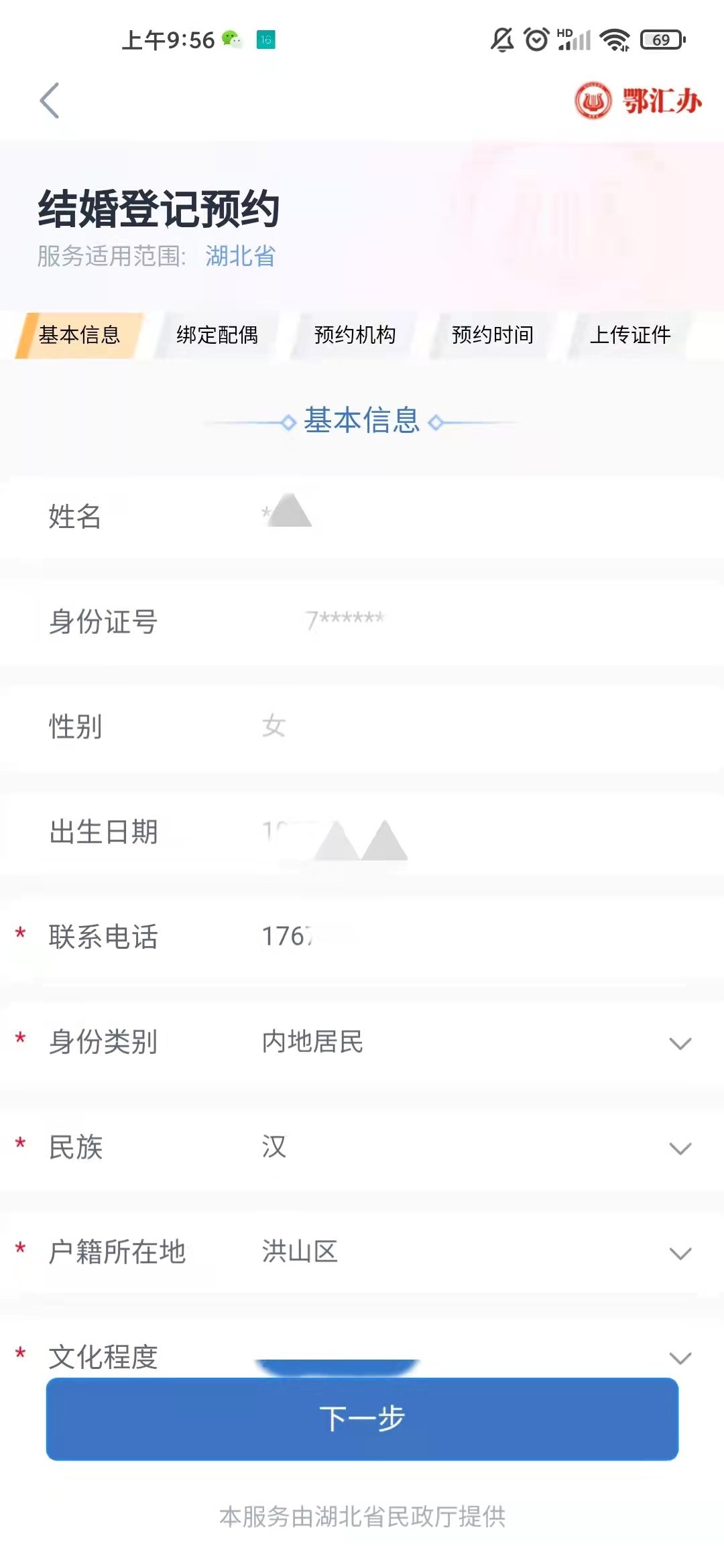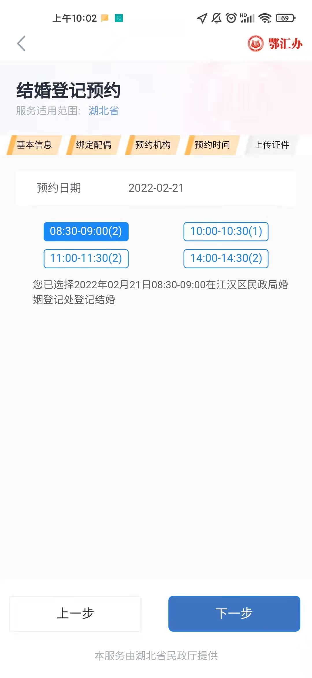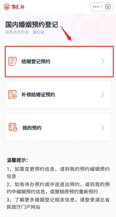 当事人可通过“鄂汇办”APP或电话027-61004200提前两个工作日进行预约。 登记当日双方需带齐户口簿及