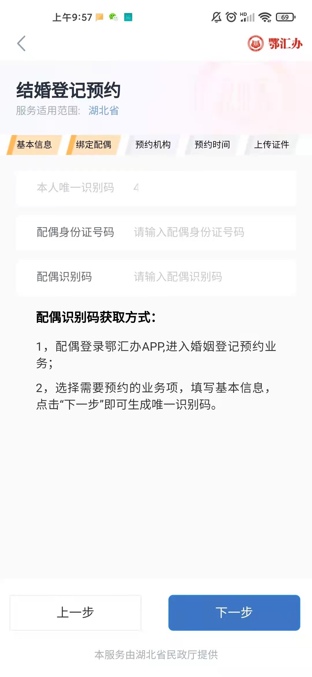 配偶识别码获取方式:需要配偶也登录鄂汇办app,进入婚姻登记预约业务,填写基本信息后获取识别码。