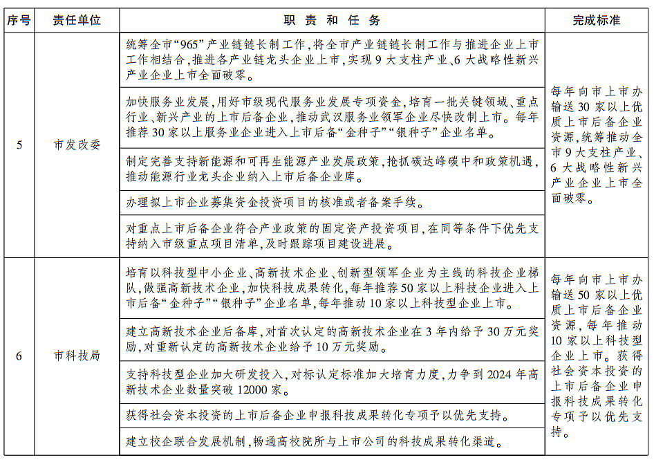按照挖掘筛选一批、培育储备一批、后备改制一批、培训辅导一批、申报上市一批的总体思路,实施企业上市培育行动,提升资本市场直接融资功能,打造资本市场高地,助推武汉区域金融中心建设。力争每年新增境内外上市企业15家以上,到2024年,全市上市企业达到143家。各区人民政府(含开发区、风景区、长江新区管委会,下同)要结合实际和全市目标,制定本区未来3年企业上市工作目标。