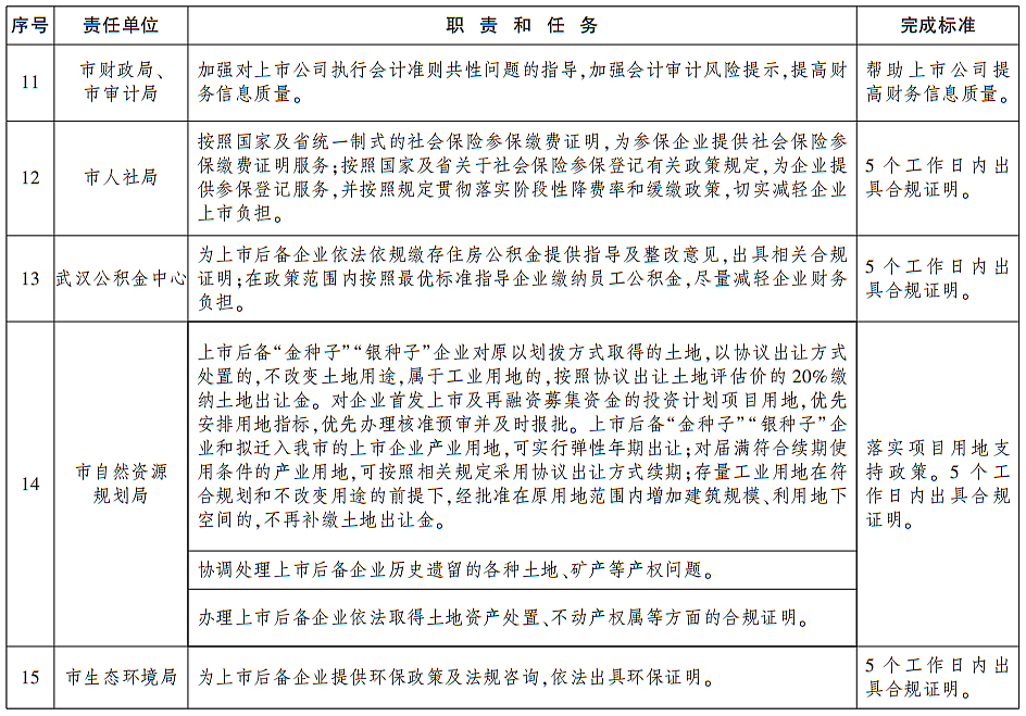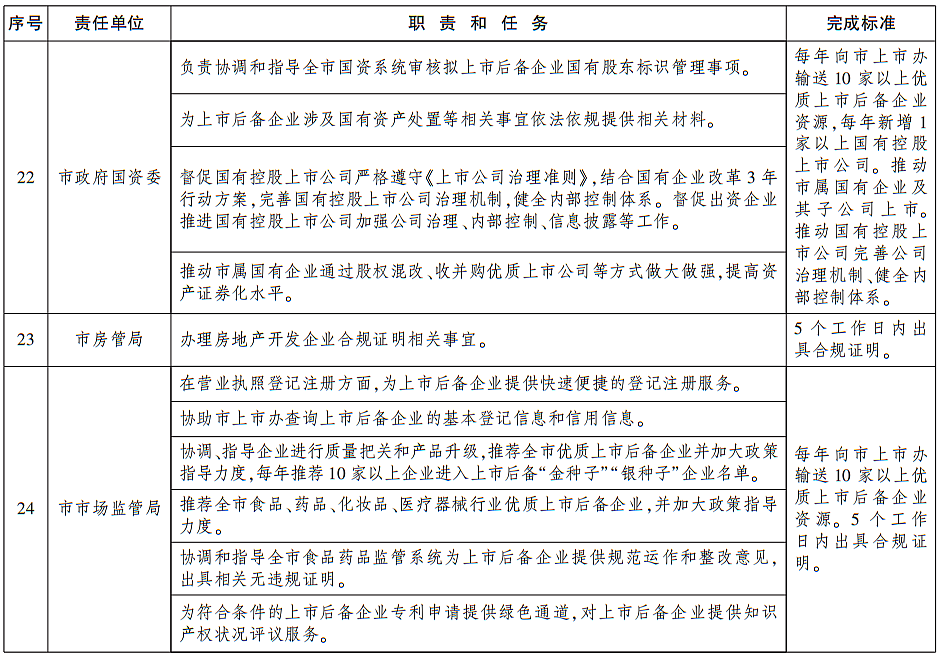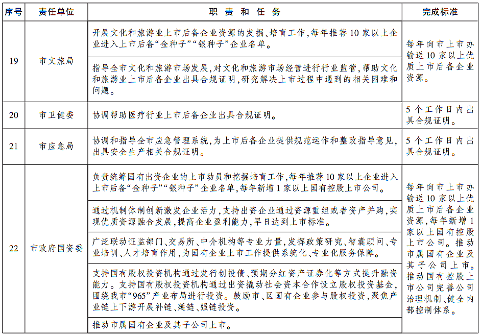 (二)落实工作责任。各区人民政府和市直相关部门要高度重视,把企业上市作为推动经济高质量发展的重要工作来抓。加快建立区人民政府负责人结对扶持上市后备企业制度。市发改委、市科技局、市经信局、市政府国资委等行业主管部门负责相关产业培育,支持相关行业企业做大做强。各级行政执法部门负责指导支持上市后备企业规范发展,帮助企业开具合规证明。