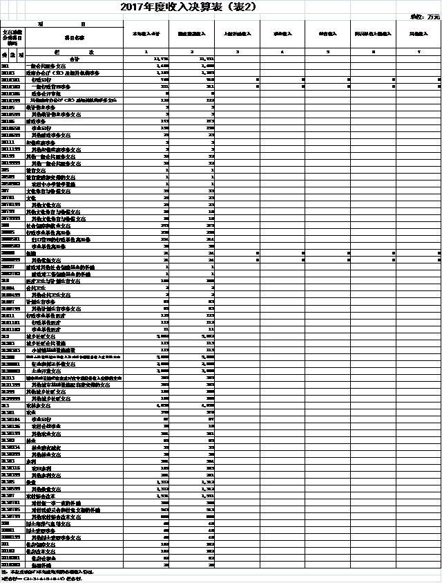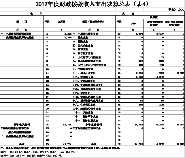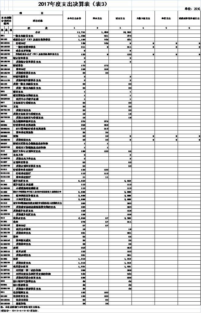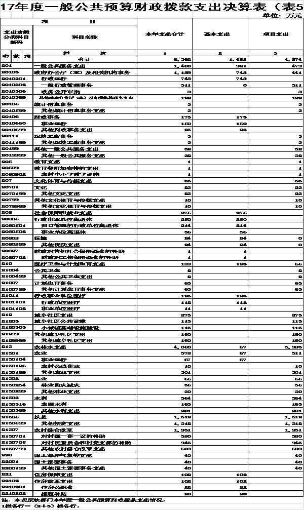 2017年度财政拨款支出6,362万元,主要用于以下方面:一般公共服务(类)支出1,400万元,占22.01 %;国防支出0万元,占0%;公共安全支出0万元,占0 %;教育支出1万元,占0.02%;科学技术支出0万元,占0%;文化体育与传媒支出33万元,占0.52%;社会保障和就业支出275万元,占4.32%;医疗卫生与计划生育支出188万元,占2.96%;节能环保支出0万元,占0%;城乡社区支出273万元,占0.07%;农林水支出4,050万元,占63.66%;交通运输支出0万元,占0%;资源勘探信息等支出0万元,占0%;商业服务业等支出0万元,占0%;援助其他地区支出0万元,占0%;国土海洋气象等支出40万元,占0.63%;住房保障支出102万元,占1.60%;粮油物资储备支出0万元,占0%;其他支出0万元,占0%;债务付息支出0万元,占0%。