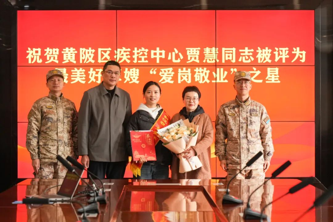 3月6日上午,国际劳动妇女节即将来临之际,空降军某部政治工作处何智钦主任、教导员丁凯一行为区疾控中心贾慧同志颁发“最美好军嫂奖章”,并向全体女职工致以节日的问候。区疾控中心主任刘志华、副主任魏沨陪同参加了授奖仪式。
