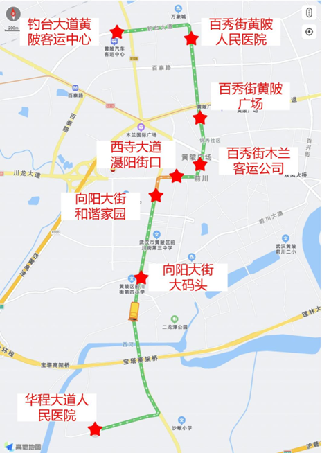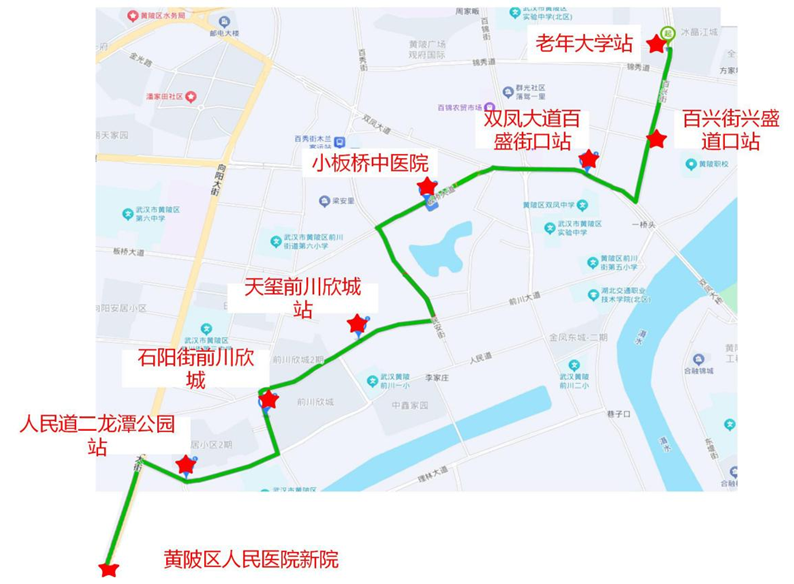 免费公交专线:老年大学站、百兴街兴盛道口站、双凤大道百盛街口站、小板桥中医院、天玺前川欣城站、石阳街前川欣城站、人民道二龙潭公园站、华程大道人民医院新院区(原路返回)