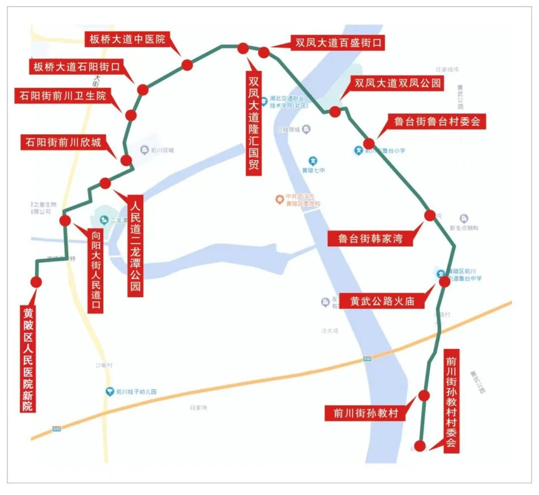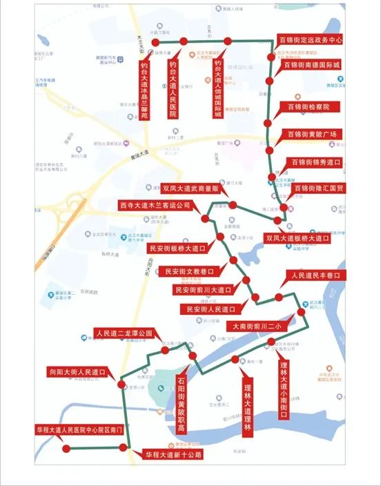 P9路:华程大道人民医院新院区、华程大道新十公路口、向阳大街人民道口、人民道二龙潭公园、石阳街黄陂职高、理林大道理林、理林大道小南街口、大南街前川二小、人民道民丰巷口、民安街人民道口、民安街前川大道口、民安街文教巷口、民安街板桥大道口、西寺大道木兰客运公司、双凤大道武商量贩、双凤大道板桥大道口、百锦街隆汇国贸、百锦街锦秀道口、百锦街黄陂广场(地铁7号线站点)、百锦街检察院、百锦街南德国际城、百锦街定远政务中心、钓台大道人信城国际城、钓台大道人民医院老院区、钓台大道冰晶兰馨苑、钓台大道黄陂客运中心。首末班时间为6:00-18:00。
