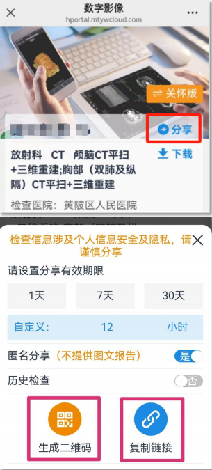 6影像分享:点击“分享”按钮,选择分享期限及方式,复制链接或二维码给对方