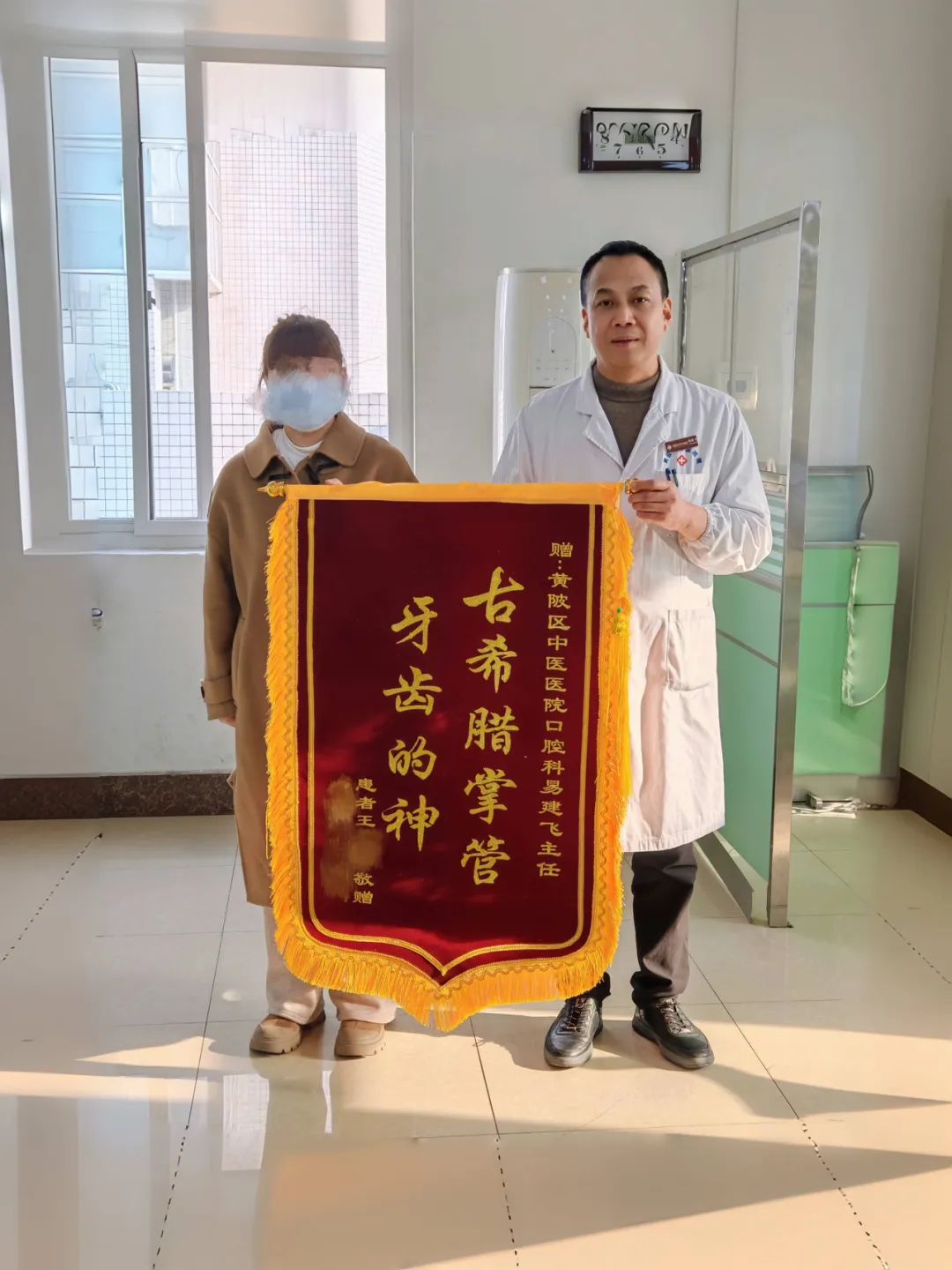 近日,楼凤网 中医医院口腔科迎来了一位满面笑容的患者小王,她将一面致谢锦旗送到了口腔科副主任医师易建飞手中,赞他是“古希腊掌管牙齿的神”,这种新潮的感谢语让医生开心不已。
