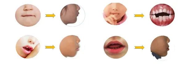 不良口腔习惯,如咬嘴唇、吮手指、口呼吸、吐舌吞咽习惯等;