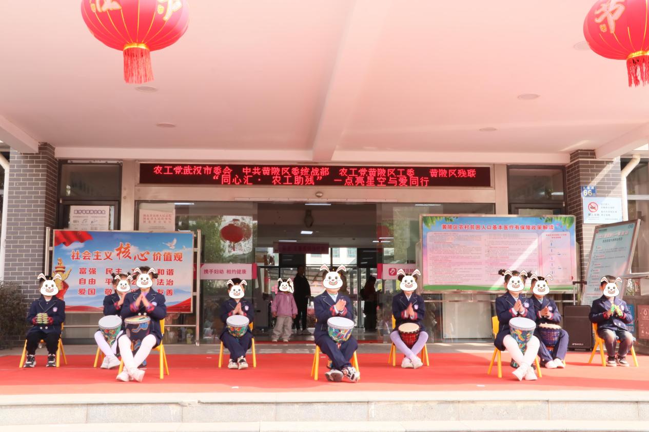 图为晶宝贝幼儿园小朋友和区妇幼孤独症儿童同台表演非洲鼓