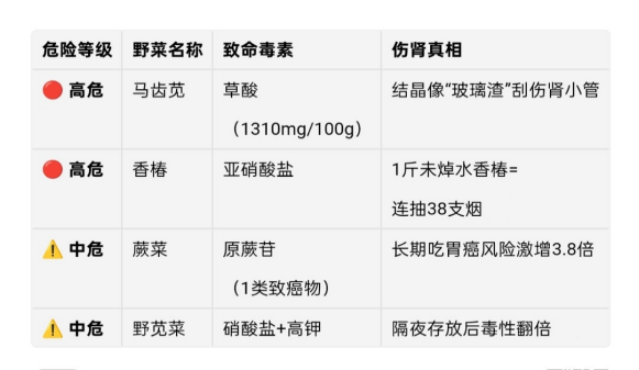 春回大地,野菜成为餐桌上的“限定美味”,但近年因误食野菜引发的急性肾损伤事件频发。如何安全享用春天的馈赠?我们为您揭示野菜中的“隐形杀手”,并提供科学防护指南。