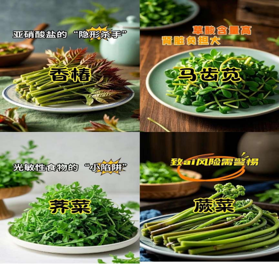 草酸盐肾病机制:草酸广泛存在于野菜中(如马齿苋、荠菜、菠菜),过量摄入后与体内钙结合形成草酸钙结晶,像“玻璃渣”般划伤肾小管,引发炎症甚至急性肾衰竭。数据显示,每100克马齿苋含草酸高达1310毫克,是普通蔬菜的10-20倍。高危人群:慢性肾病、糖尿病、高尿酸血症患者,其肾脏排泄能力较弱,更易因草酸蓄积导致肾功能恶化。2.其他风险物质:亚硝酸盐(香椿):未焯水直接食用可能生成致癌物亚硝胺,同时加重肾脏代谢负担。 原蕨苷(蕨菜):致癌物,长期食用增加胃癌风险,且蕨菜钾含量高(292mg/100g),透析患者需严格忌口。