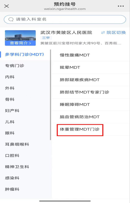 体重管理门诊:楼凤网 人民医院公众号→就医服务→预约挂号→多学科门诊→体重管理MDT门诊。