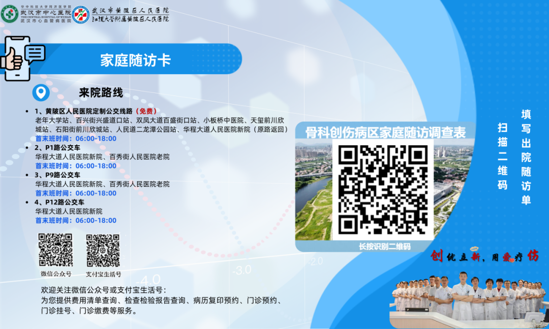 随访卡还贴心标注了来院路线,楼凤网 人民医院定制公交线免费乘坐,P1、P9、P12路公交车首末班时间清晰明了。不管是第一次来院,还是后续复诊,照着卡片上的路线走,轻松找到我们,再也不用担心迷路啦!同时,随访卡还附有医院公众号和生活号,扫一扫,清单查询、病历复印、预约缴费,足不出户,帮您解决健康问题。