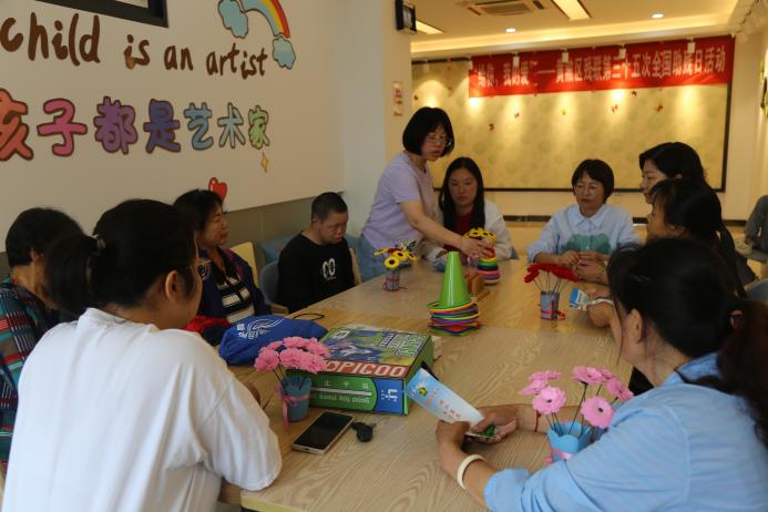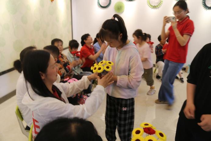 活动在残疾儿童充满活力的音乐律动表演中拉开帷幕。孩子们用非洲鼓演奏出欢快的节奏,展现他们的自信与才华,赢得了现场观众的阵阵掌声。在亲子手工DIY环节,残疾儿童与家长共同制作精美的手工花束。在老师和志愿者的指导下,小朋友们认真完成每一朵花的制作,现场温馨而欢乐。活动还特别设置了“送花仪式”,孩子们将亲手制作的花束献给母亲和老师,表达对她们辛勤付出的感恩之情,也为即将到来的母亲节增添了暖意。