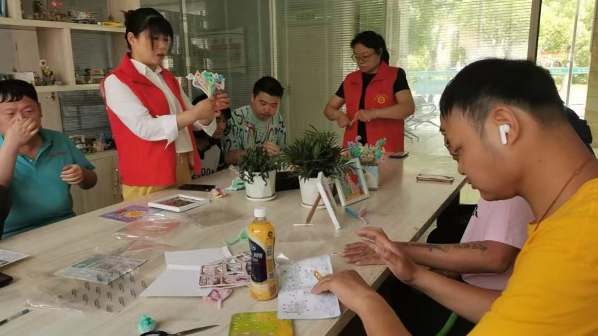 手工活动在温馨的轻音乐中拉开帷幕,10名残疾朋友在工作人员和志愿者的陪伴下,用灵巧的双手创作出独一无二的作品,每一件手作都承载着他们细腻的情感和对生活的热爱。