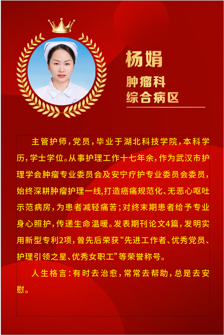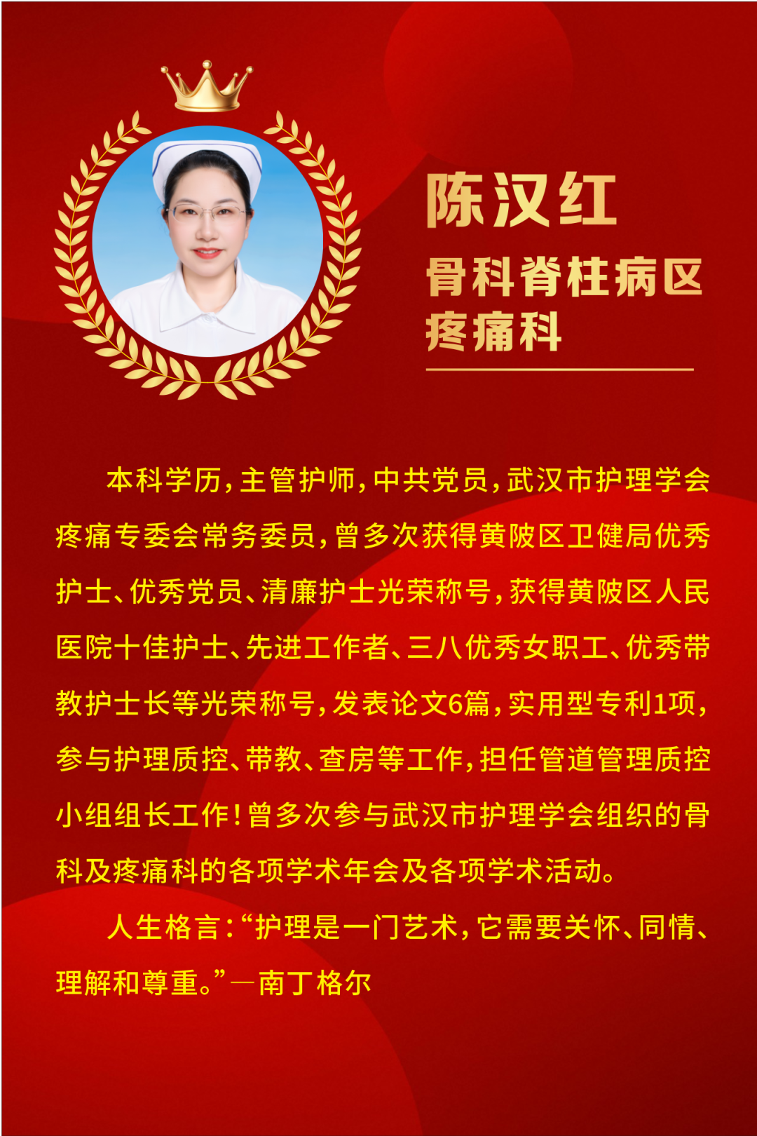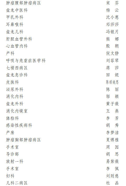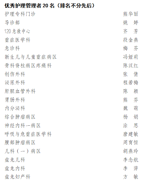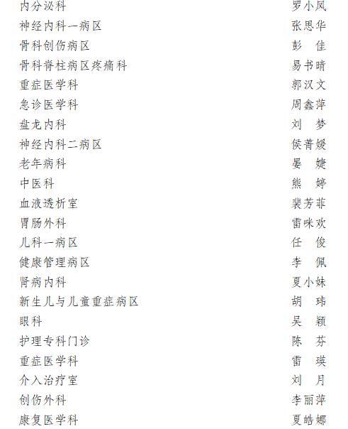 第114个国际护士节之际,为了表彰在护理工作中表现突出、贡献卓越的护理人员,进一步弘扬南丁格尔精神,充分发挥先进典型的模范作用,激励广大护理工作者发扬精益求精、无私奉献的光荣传统,营造有利于护理队伍建设和护理工作发展的良好氛围,提升护理服务质量,医院决定对一批优秀护士、优秀护理管理者进行表彰,人员名单如下。