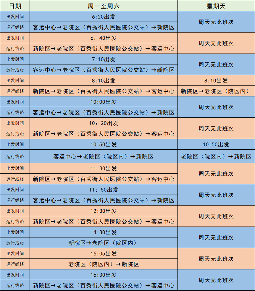 1号通勤车:新院区停靠点(急诊楼前);老院区停靠点(见时刻表);区客运中心停靠点(P1路公交车站)