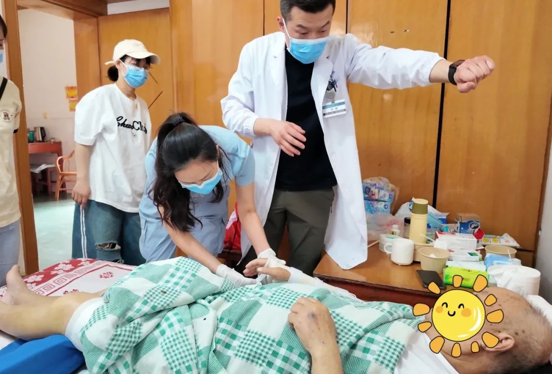 5月11日,曾爷爷因意外摔倒,导致髋部骨折,住院期间,历经骨科创伤病区及重症监护室的双重闯关,在医护康团队的保障下才得以顺利出院。此次随访针对伤口护理、功能锻炼指导、用药管理、居家护理建议、复诊安排等问题为患者逐一解答。肖兢主任对患者伤口进行全面细致的检查与规范换药操作,耐心向患者及家属详细讲解术后伤口护理的关键要点,逐一强调注意事项提供专业指导;护士长熊君通过现场示范、分步讲解的方式,指导患者进行针对性肢体功能训练,给予循序渐进的锻炼建议;团队专科护士还针对曾爷爷的情况,给予了日常居家护理的建议,从饮食营养搭配到休息睡眠姿势,医护人员都一一进行耐心讲解,全方位保障患者居家康复安全。