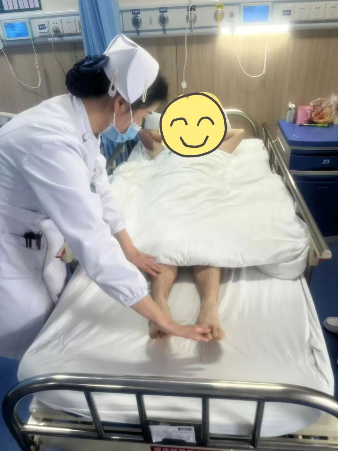 看到病情好转,护理团队更积极投入康复护理。指导患者从床上被动活动开始,逐步过渡到主动肌肉力量练习。在护理人员的照料和鼓励下,患者能进行简单活动,脸上重现笑容。