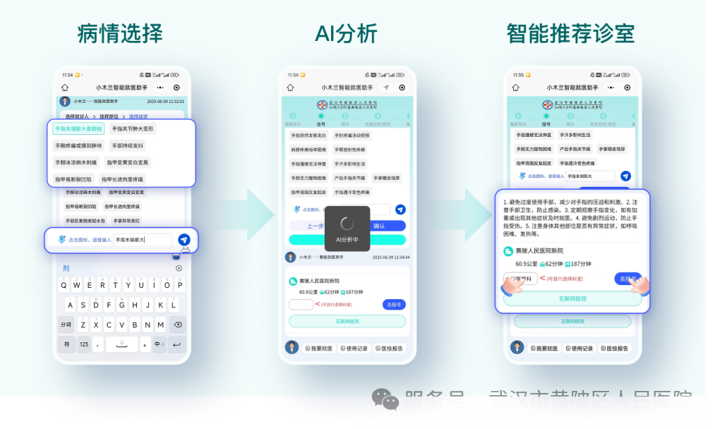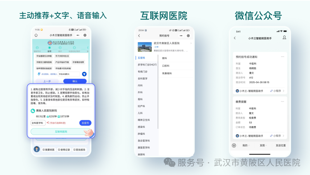 “小木兰”智能就医助手有三大功能:第一,从“满屏找”到“主动推”、“智能问”,患者不用纠结到底是“先交费”还是“先查报告”;第二,从“大系统”到“微指令”,通过封装高频“微服务”,例如“我要就医”、“使用记录”、“医技报告”等窗口指令,点击就可以直接进入系统;第三,“小木兰”可结合患者的地理定位、科室当前就诊流量、医生问诊效率进行动态计算,生成患者就医路径。