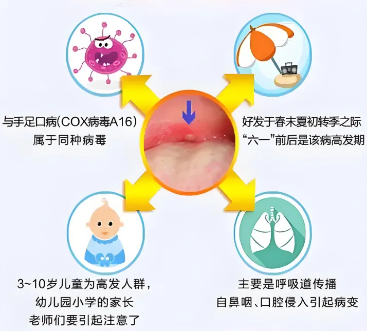 症状特点:突发高热、咽痛,咽峡部可见小疱疹或溃疡,可伴咳嗽、食欲不振等。少数可能引发严重并发症。