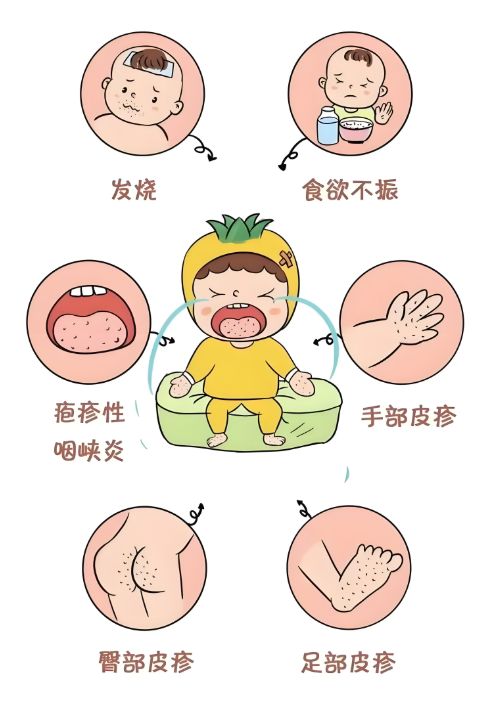症状特点:发热,手心、脚心、口腔出现疱疹或溃疡(疼痛明显),少数可发展为重症。